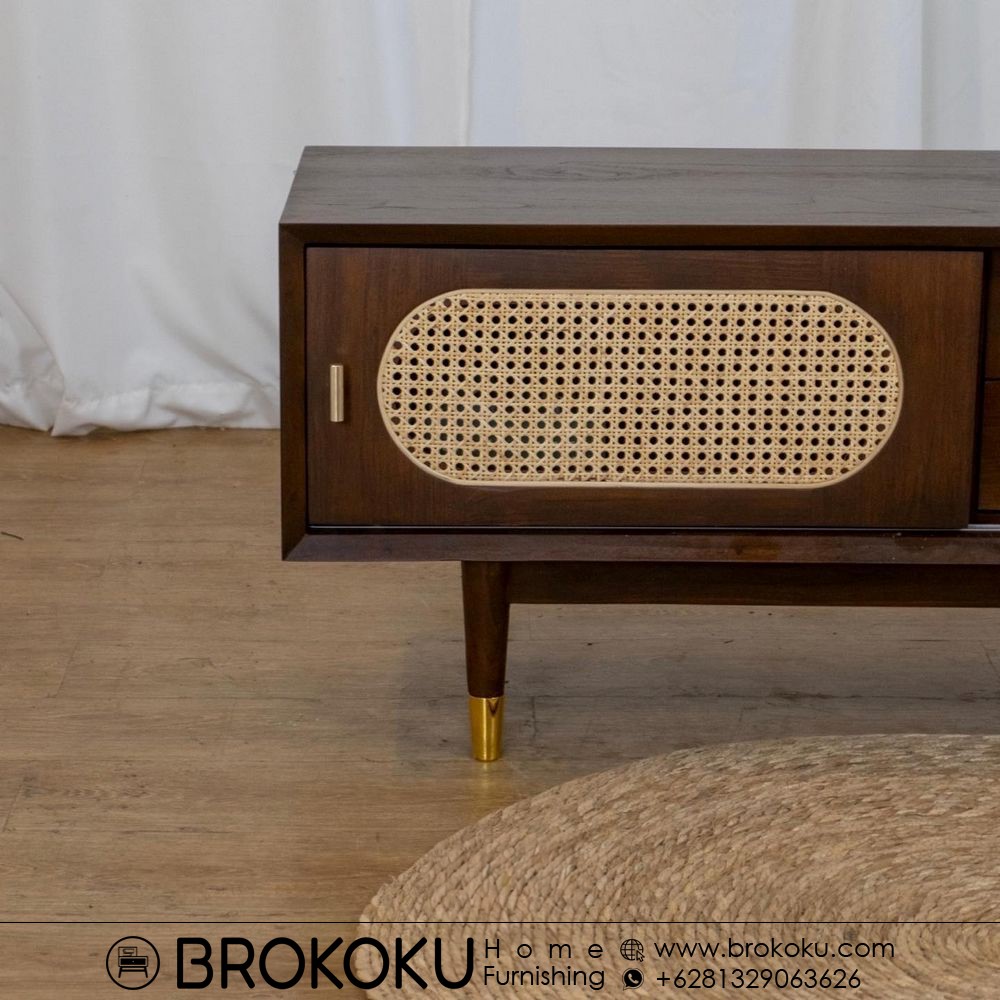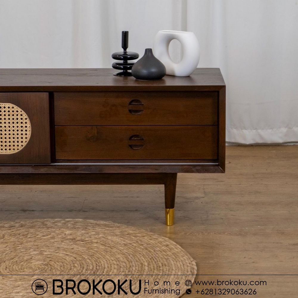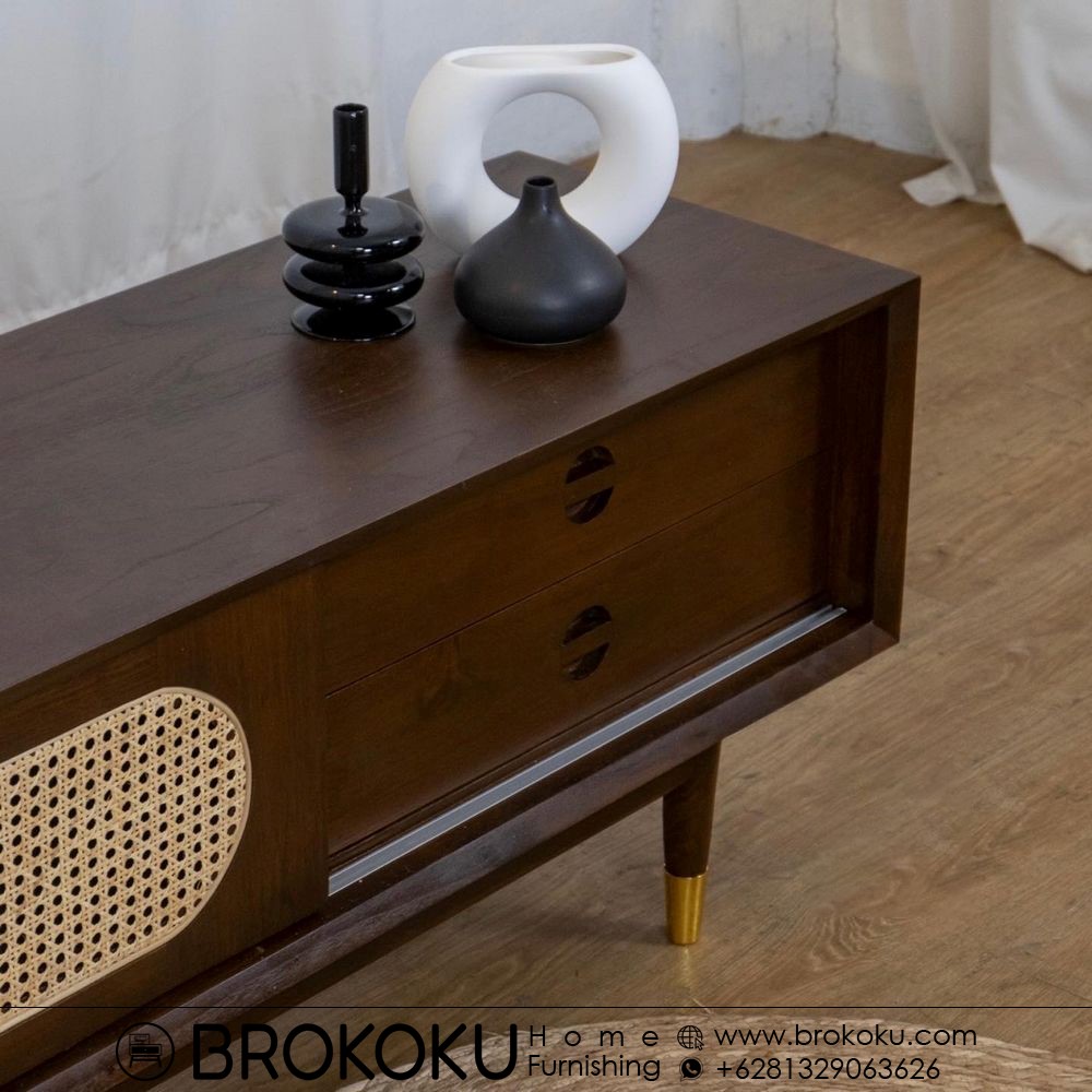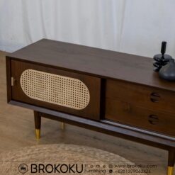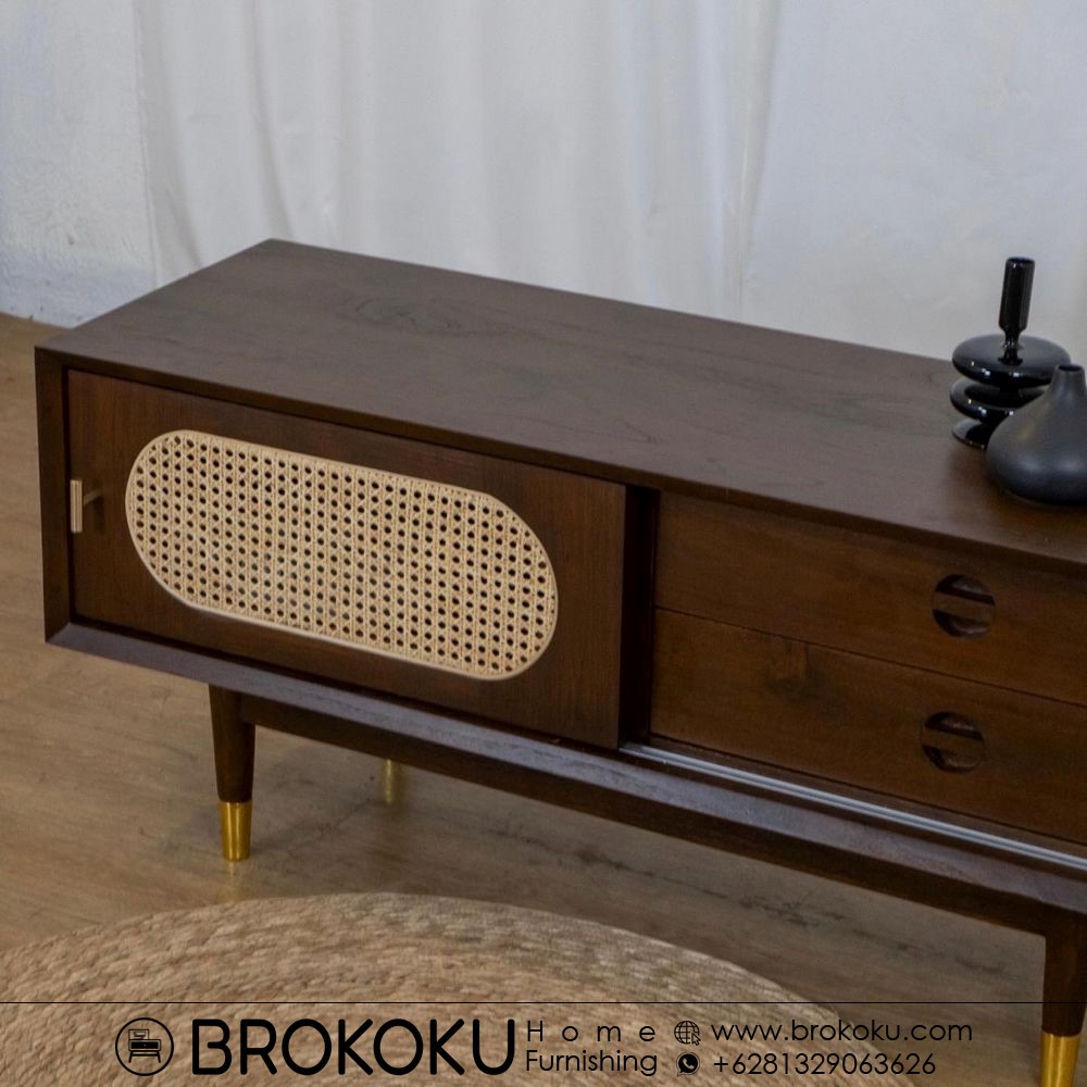 Bufet retro scandinavian jati 1 pintu 2 laci BHF-291, bufet jati jepara, bufet kayu jati minimalis, bufet retro modern, bufet scandinavian style, bufet jati pintu sliding panel rotan 2 laci, bufet minimalis bahan kayu jati solid kombinasi rotan alami produksi brokoku home furnishing dengan spesifikasi sebagai berikut: