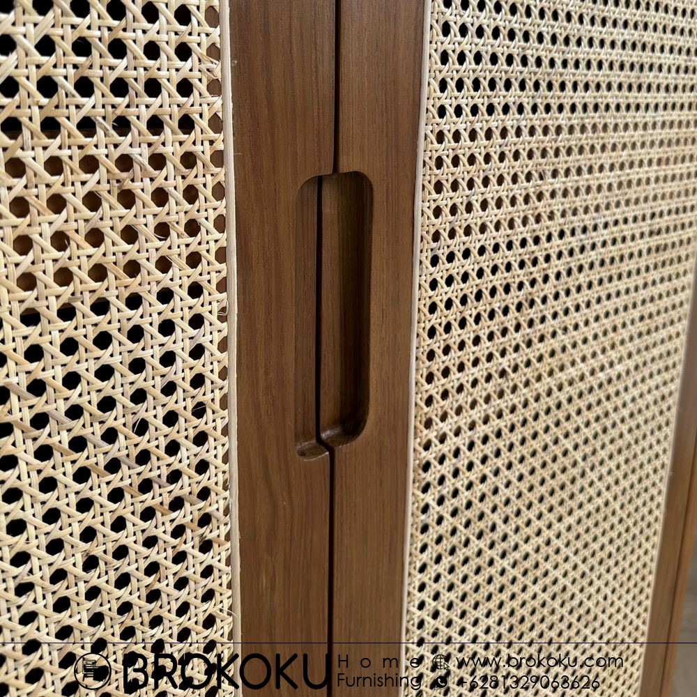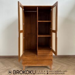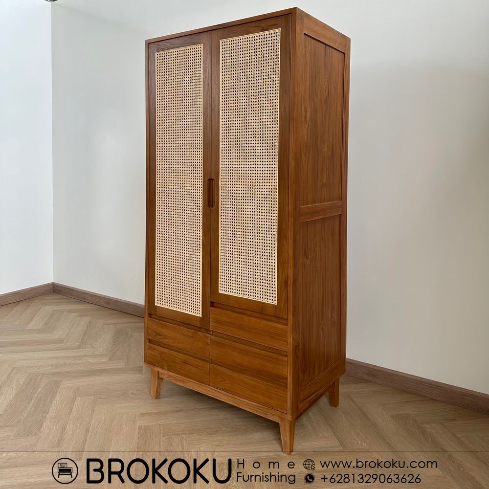 Lemari kayu jati 5 laci 2 pintu rotan minimalis BHF-267, Lemari pakaian jati, lemari jepara, lemari minimalis kayu jati kombinasi rotan, lemari jati jepara minimalis, lemari pakaian retro, lemari pakaian minimalis modern bahan kayu solid dan rotan alami produksi brokoku home furnishing dengan spesifikasi sebagai berikut: