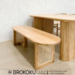 Set meja makan kayu jati 1 bangku 3 kursi wishbone BHF-221, meja makan jati jepara, set meja makan minimalis, set meja makan wishbone, meja makan jepara kayu solid finishing bleaching rapi formasi 1 meja, 3 kursi dan 1 bangku produksi brokoku home furnishing dengan spesifikasi sebagai berikut: